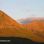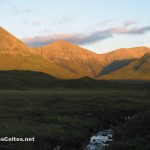 A l’ouest des Cuillin Hills la route A863 traverse le Glen Drynoch, qui s’étend entre Drynoch (non loin de la fameuse distillerie de Talisker, unique whisky de Skye, mais quel whisky !) et Sligachan, au croisement avec la A87, principale route de l’île. La route traverse (c’est une habitude à Skye !) de vastes tourbières en gardant à l’oeil les superbes montagnes des Cuillin Hills. Le soleil qu’on a dans le dos dans cette vallée (en tout cas dans le sens qu’on a pris !) fait ressortir les lignes harmonieuses de ce qui semble être d’anciens volcans. Absolument magnifique ! Mais que dire alors du coucher de soleil sur ces mêmes montagnes lors du retour vers Broadford après une pause à Portree … Les montagnes prennent une teinte orangée extraordinaire ! Une vision paradisiaque … Mais les midges sont très vite présents pour vous ramener à la réalité. Et oui, j’ai souffert pour prendre ces photos ! Mais vous serez d’accord : ça en valait la peine !