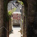 Perchée au sommet d’une colline annonciatrice des monts du Mené, au confluent de l’Évron et du ruisseau de l’Étang, la cité médiévale de Moncontour est un des plus beaux villages de Bretagne, labellisé « Petite cité de caractère » et « Plus beaux villages de France ». Vous avez peut-être aperçu Moncontour à la télévision en 2017, le village se plaçant quatrième dans l’émission « Village préféré des Français ». Située à environ 25 kilomètre de Saint-Brieuc, au coeur des Côtes d’Armor, la cité constituait une place forte pour défendre Lamballe, capitale du Duché de Penthièvre. De cette époque la cité conserve ses remparts construits aux 13ème et 14ème siècle, ainsi que les vestiges de son château, même s’ils ont été démantelés sur ordre de Richelieu en 1626. Perdant son rôle militaire, Moncontour se tourne alors vers le commerce. À partir du milieu du 17ème siècle, au même titre que d’autres villages bretons comme Locronan, c’est la culture du lin et du chanvre et l’export de toiles vers l’Europe et vers les Indes qui fera la fortune de Moncontour jusqu’à la Révolution. Il reste de ce passé glorieux de belles maisons bourgeoises et des monuments emblématiques qu’on se plaît à découvrir en parcourant les rues sinueuses et escarpées du village.