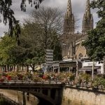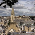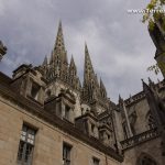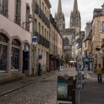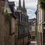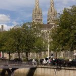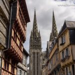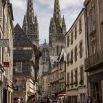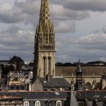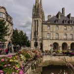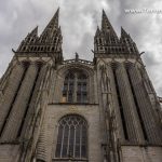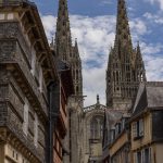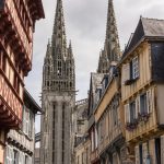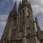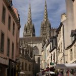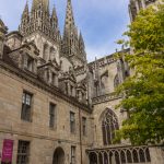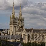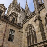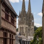- Les flèches de la cathédrale Saint-Corentin dominent les rues du Vieux Quimper. Édifiée entre le 13ème et le 15ème siècle, c’est une des plus anciennes de Bretagne. Malgré la longue période sur laquelle sa construction s’est étalée, la cathédrale jouit d’une véritable unité architecturale, mise en valeur par la restauration réussie des années 1990 et 2000. Les flèches actuelles, de style néo-gothique, ont été construites en 1856 à la place des anciennes flèches endommagées par un incendie en 1720. Entre ces deux flèches trône une statue du roi Gradlon montant sur son cheval : un hommage au roi légendaire qui aurait créé la ville ! La caractéristique frappante de la cathédrale Saint-Corentin est le léger désaxement (10°) du choeur par rapport à la nef. La légende dit que ce désaxement symbolise la position de la tête du Christ sur sa croix. Mais il est plus vraisemblablement le résultat des contraintes de construction de la cathédrale (structures existantes, sol humide et instable, proximité de la rivière, etc…).