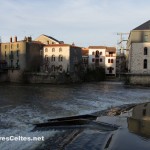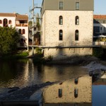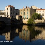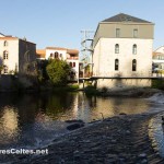 - On prend ensuite à gauche pour traverser la Sèvre Nantaise sur le Pont de la Vallée. Belle vue de part et d’autres. En amont, sur la gauche un ancien moulin, le Moulin du Château. Sur la droite l’impressionnant château de Clisson domine la rivière. En aval, paysage très romantique avec la rivière bordée d’arbres et dominée par la ville dont émerge le clocher de l’église Notre-Dame.