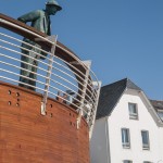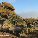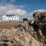 Entre Pornichet et Saint-Nazaire, les longues baies sableuses laissent la place à une côte rocheuse, une succession de pointes et des falaises entrecoupées de criques abritant des petites plages bien plus intimistes que les interminables plages de la baie de La Baule. C’est au coeur de cette côte, sur la commune de Saint-Nazaire, que se trouve la petite station balnéaire de Saint-Marc-sur-Mer. Le village s’appelait autrefois Crépelet mais ne fut rebaptisé Saint-Marc qu’au 19ème siècle en l’honneur du saint à qui la chapelle du bourg fut érigée. Saint-Marc-sur-Mer est célèbre pour sa Plage de Monsieur Hulot où Jacques Tati installa ses caméras en 1951 pour tourner les scènes extérieures du film Les vacances de Monsieur Hulot. Les cinéphiles reconnaîtront en particulier le cours de tennis qui a vu Monsieur Hulot s’exercer à son service si particulier, ou encore L’Hôtel de la plage, récemment rénové, qui domine toujours la plage. Sur une plateforme dominant la plage, une statue inaugurée en 1999 et représentant la silhouette de Monsieur Hulot scrutant l’horizon, rend d’ailleurs hommage au cinéaste et à ce célèbre film.