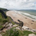 A quelques kilomètres au nord de Coleraine, Portstewart est une station balnéaire victorienne paisible et de haut standing. Elle bénéficie d’une magnifique plage, Portstewart Strand, un long croissant doré dominé par des dunes sauvages qui s’étend à l’est de la ville jusqu’à l’embouchure de la rivière Bann. La plage est gérée par le National Trust (accès payant). Ne cherchez pas de parking, on se gare … sur la plage ! Des pieux séparent les différentes zones de la plage : partie réservée aux baigneurs, partie réservée aux surfers (la plage est un spot réputé) et partie accessible à tous, en particulier aux véhicules. Au loin vers l’ouest, on aperçoit la silhouette des falaises de Downhill et du Mussenden Temple.