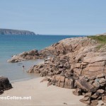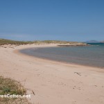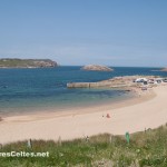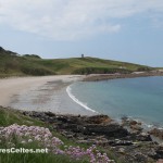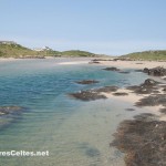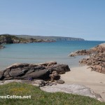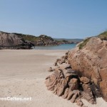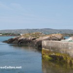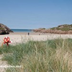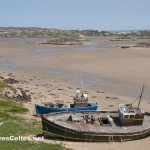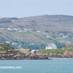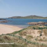Au nord de Dungloe, la péninsule des Rosses (Na Rossa en gaélique) est une région sauvage couverte de landes, de rochers et de lacs, qui cache le long de sa côte des criques et des plages superbes. C’est sous le soleil que la région dévoile tous ses charmes, quand le soleil fait exploser les couleurs des rochers roses et des dunes et plages de sable blanc. La R259 fait le tour de la péninsule de Dungloe jusqu’à Crolly. N’hésitez pas à vous perdre sur les petites routes qui partent de la R259 dès que vous voyez un panneau Tra (« plage » en gaélique). Après avoir contourné des rochers ou des lacs et croisé des maisons isolées, vous découvrirez des criques et des plages superbes, souvent désertes. A l’entrée de la péninsule (en venant de Dungloe), Burtonport est le point de départ du ferry vers Aran Island dont la silhouette au large domine la côte. Le port n’a pas beaucoup de charme, un restaurant affichant un homard géant qu’on ne peut pas rater, une éolienne qui domine le port et des quais qui servent surtout de parking pour les passagers du ferry. Mais la vue sur Aran Island et la baie mérite bien un petit détour. Beaucoup plus intéressante par contre l’île de Cruit Island, accessible depuis Kincaslough par un pont en pierre. L’île tout en longueur est traversée par une route unique qui longe des plages de sable doré (avec à l’horizon le pic argenté de Errigal Mountain), traverse des zones marécageuses, se faufile entre les rochers et croise des chaumières traditionnelles du Donegal. La route se termine en traversant un golf (attention aux balles perdues !) et par une jetée qui fait face à l’île d’Owey.