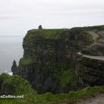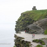 Le point de vue sur les falaises se situe entre Liscannor et Doolin, le long de la R478. Depuis un parking payant et obligatoire, on accède à un point de vue sur les falaises. Sortez vos appareils et faites vous beau (ou belle !) pour poser devant les falaises, cliché souvenir incontournable d’un voyage en Irlande ! Car le site est évidemment incontournable lors d’un périple en Irlande ! Et de fait, les touristes qui visitent l’île d’Emeraude se précipitent nombreux pour admirer les falaises. On estime même qu’un million de visiteurs viennent admirer les falaises de Moher chaque année ! Evidemment avec les conséquences néfastes que peut avoir un tel tourisme de masse sur un site naturel et donc fragile … Le piétinement incessant des touristes sur le sommet des falaises a rendu le site particulièrement dangereux, obligeant les autorités locales à aménager le site pour protéger à la fois les visiteurs et le site lui-même. Des murs de pierre empêchent désormais les touristes d’approcher du bord des falaises, un sentier aménagé permettant de longer les falaises jusqu’à Hag’s Head, vers le sud. Le sentier qui menait il n’y a pas longtemps (lors de mon premier passage en 2000 par exemple) jusqu’à la tour O’Brien est fermé, en attendant qu’il soit à son tour aménagé (réouverture en 2008). De moins bon goût, le point de vue a été aménagé en espèce d’amphithéâtre de béton …