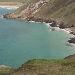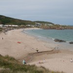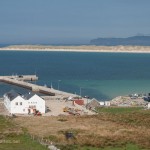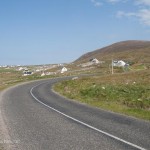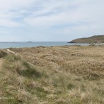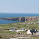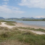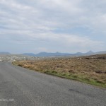 Juste après Crolly la R257 pénètre dans la péninsule de Gweedore (Gaoth Dobhair en gaëlique), haut lieu de la langue gaélique. Cette portion de Gaeltacht est en effet la première région d’Irlande par le nombre de locuteurs gaéliques. La région est également réputée pour la qualité de sa musique traditionnelle : le merveilleux groupe Altan est originaire de la région, de même que le groupe Clannad et sa plus célèbre représentante Enya. La péninsule est dominée par la montagne de Tievealehid (431 mètres). A l’entrée de la péninsule, une route sur la gauche mène vers le port de Bunbeg : un quai blotti entre des rochers gris au fond de Gweedore Bay, quelques bateaux de pêche et un hôtel désuet qui domine le port donnent beaucoup de charme à l’endroit. La compagnie Tory Island Ferry assure des liaisons vers l’île de Tory Island. Une liaison plus directe part de Magheroraty un peu plus loin, mais le trajet de Bunbeg permet de découvrir les paysages de Gweedore Bay (je ne l’ai pas fait, mais c’est ce que j’imagine facilement en regardant ma carte !). Retour sur la R257 qui traverse ensuite Derrybeg, une station balnéaire aux maisons éparpillées au milieu d’un étrange paysage de dunes couvertes d’herbes. De belles plages, un golf 9 trous, mais aussi beaucoup de résidences secondaires souvent inoccupées et qui créent une drôle d’ambiance hors saison. Heureusement en s’éloignant de Derrybeg et en se rapprochant de la pointe de Bloody Foreland, le paysage devient moins urbanisé, des petites routes partent vers l’océan et se perdent dans les dunes, offrant de chouettes promenades à la poursuite des lapins dans les dunes dominées au loin par la silhouette d’une montagne (dont j’ignore le nom). Plus loin sur la R257 on découvre la pointe de Bloody Foreland. Le paysage de dunes et de prairies laisse la place à un paysage rocailleux avec des murets de pierre qui dévalent les pentes vers l’océan. Sur la pointe on peut admirer des couchers de soleil paraît-il somptueux. Ce sont d’ailleurs les couleurs rouges que prend la roche à la tombée du jour qui ont valu à la pointe son qualificatif de bloody (sanglante). Un parking permet d’avoir un panorama sur la pointe … à condition de supporter le vent réellement infernal à cet endroit !