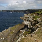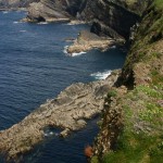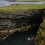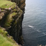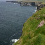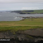 Place maintenant au grand spectacle de la péninsule de Loop Head … Tout commence à Kilkee, avec une route panoramique somptueuse : la Kilkee Scenic Road. Cette petite route longe la côte à l’ouest de Kilkee, coincée entre les collines vertes parsemées de murs de pierre et des falaises impressionnantes qui n’ont pas grand chose à envier à celles de Moher. De nombreuses facilités de stationnement permettent d’admirer les points de vue sur la côte vers Loop Head à l’ouest, ou les falaises de Moher à l’est. Attention : le vent souffle très fort sur toute la côte, du genre à vous dégager les narines et les oreilles jusqu’à vous rendre presque ivre ! Donc pas d’imprudence, les falaises sont hautes …