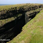 Arrivée, enfin, à Loop Head, superbe pointe offrant un panorama s’étendant par temps clair de la Péninsule de Dingle aux îles d’Aran. Là encore un vent qui décoifferait même un chauve ! Sur la pointe, un enclos entoure un phare qui ne se visite pas malheureusement. Au nord de la pointe, un gigantesque rocher n’est séparé du reste de la pointe que par un étroit gouffre dans lequel les flots s’engouffrent dans un vacarme impressionnant. Cette cassure est surnommée le Saut de l’Amant, la légende racontant qu’un homme sauta sur le rocher pour fuir les avances d’une dame un peu pressante … Mais la dame en question tomba dans la crevasse en tentant de rejoindre le pauvre homme … Mais certains racontent que la dame en question était une sorcière, alors elle a sûrement mérité son sort, non ?